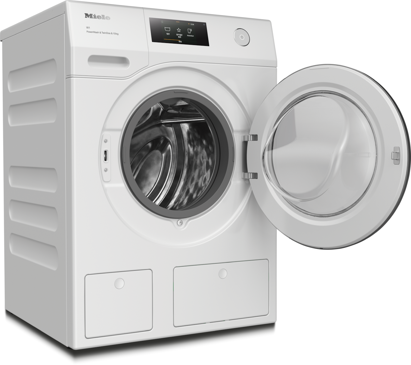 电器设定的选择方式与智能手机相同,用户可在高分辨率的明文 TFT 彩色显示屏上轻触、滑动和滚动。中央显示屏为黑色背景,上有白色文字和标识,确保信息清晰易读。用户提示信息会使用醒目的颜色显示。 - 通过TwinDos®*提供精确的洗涤剂自动配给专利 EP 2 784 205